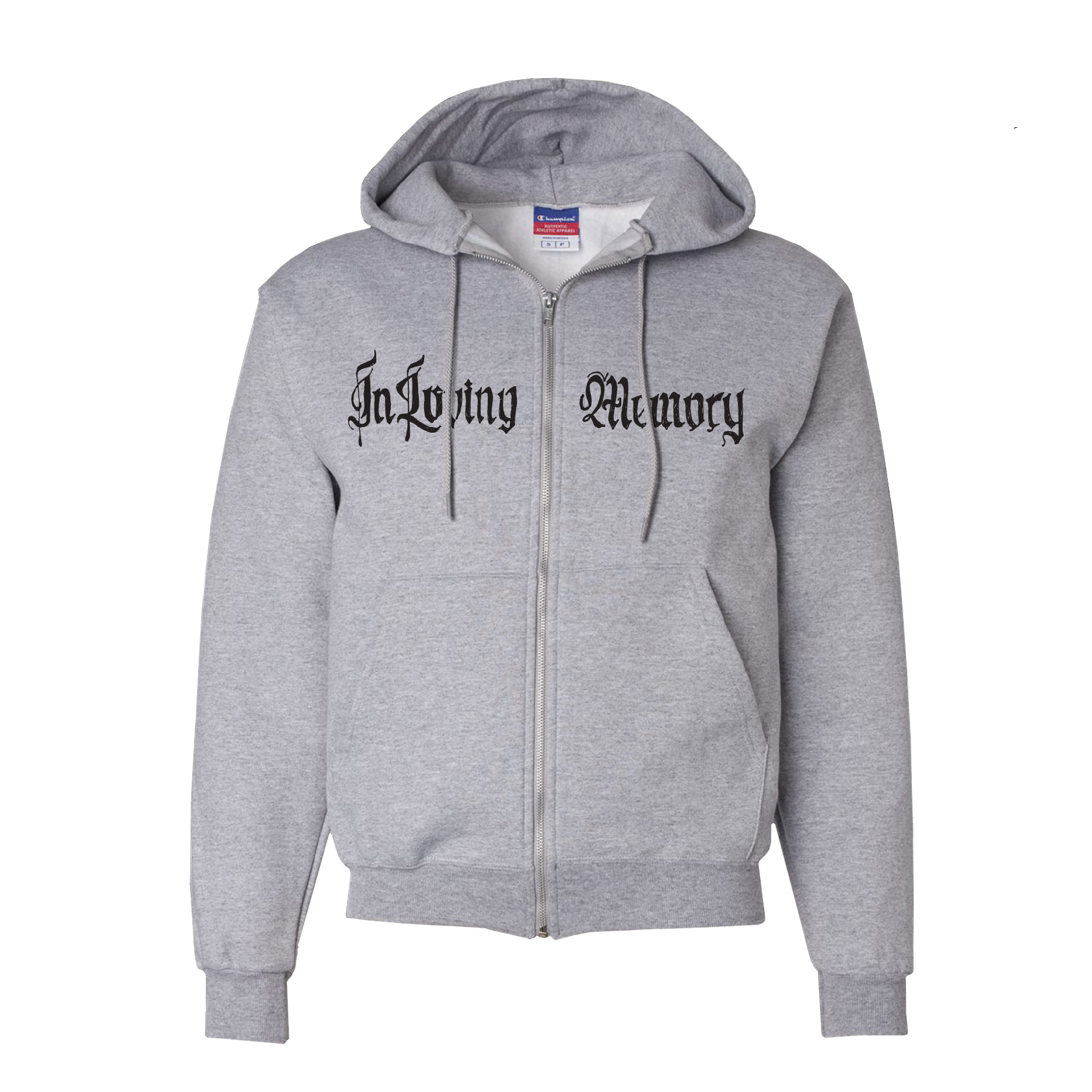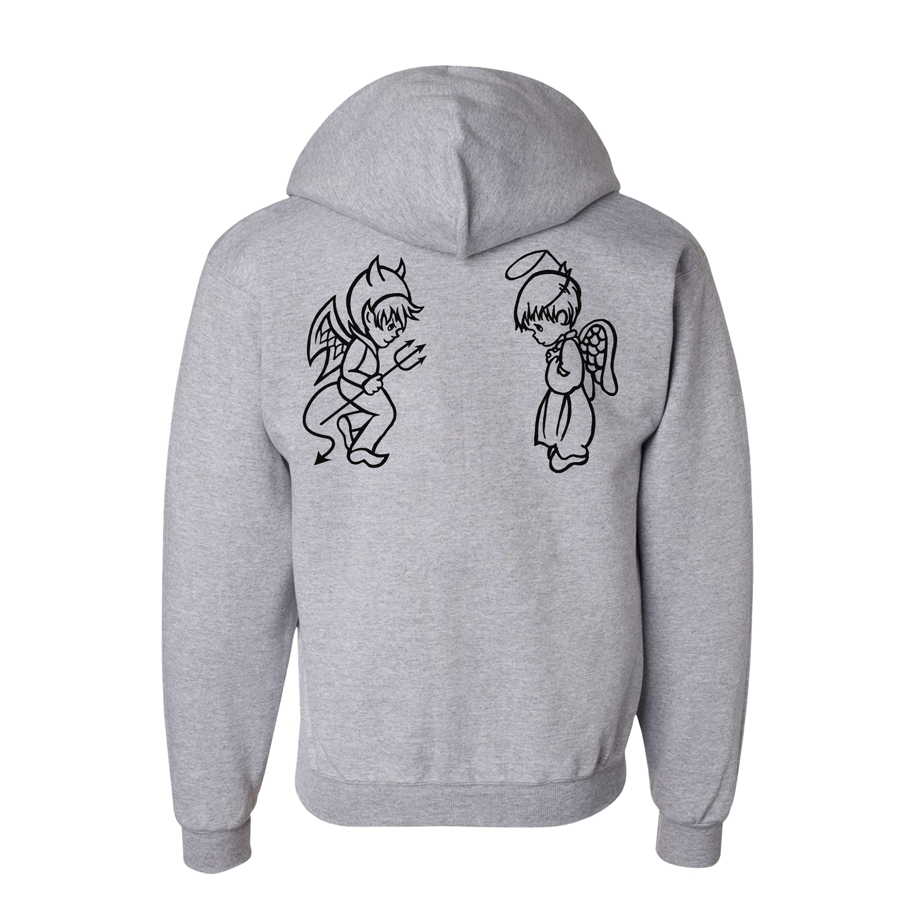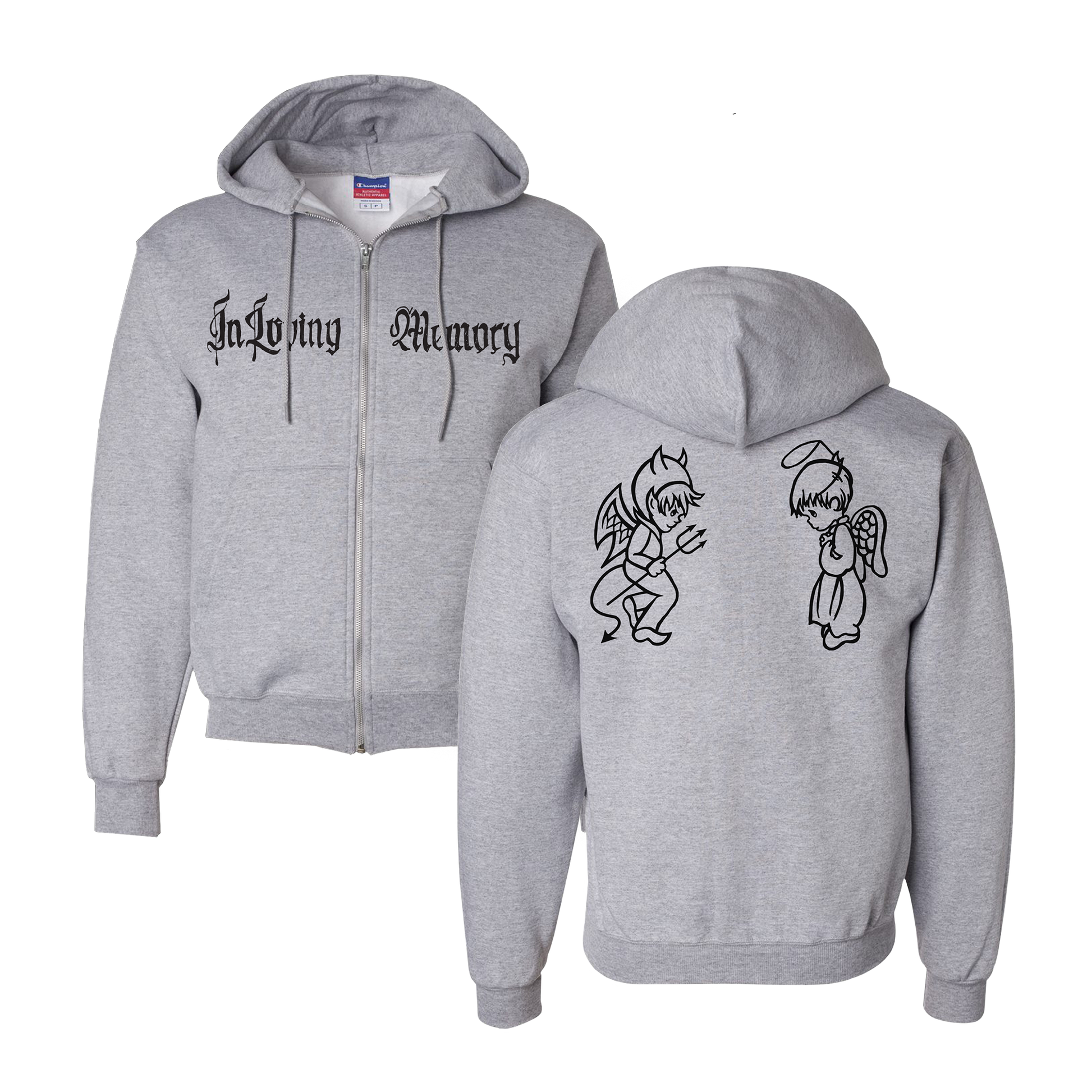 In Loving Memory Angel Devil design printed on Light Steel Champion Zip Hoodies.