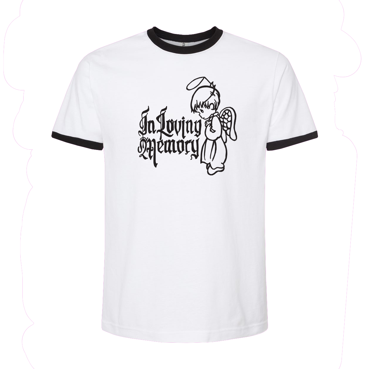 In Loving Memory Angel design printed on White and Black Ringer. Relaxed fit